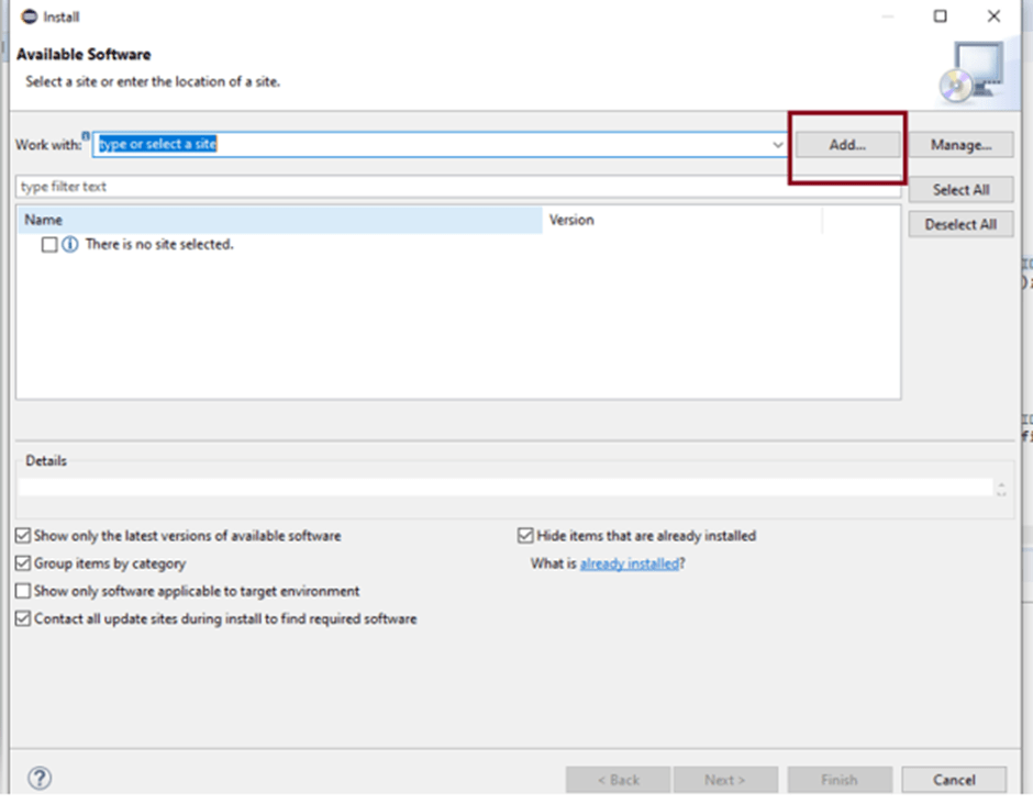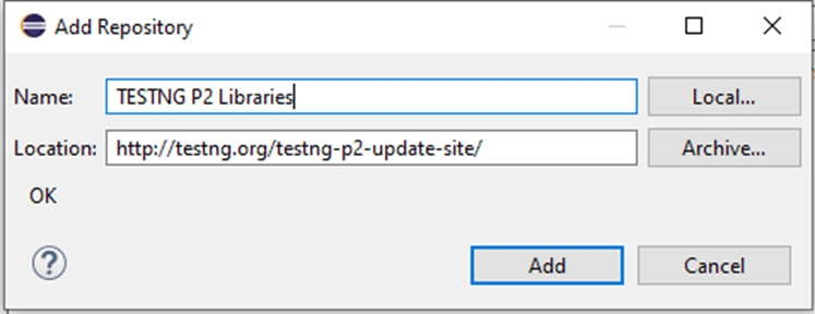 3) A new dialog box will appear. Mention the Name as TestNG and the location as “TestNG P2 – https://testng.org/testng-p2-update-site” and click the Add button.