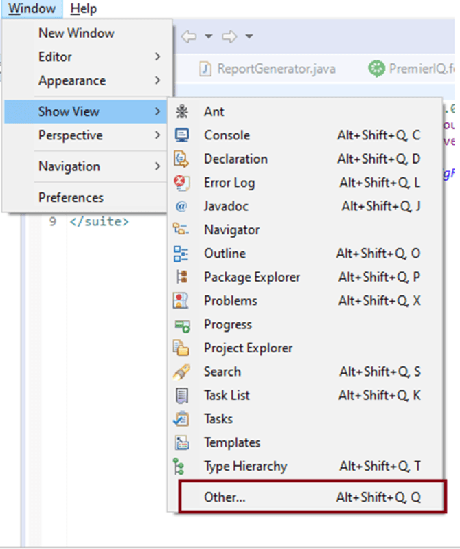 7) To verify if TestNG is installed successfully or not, go to Window, select Show View, and then Other.