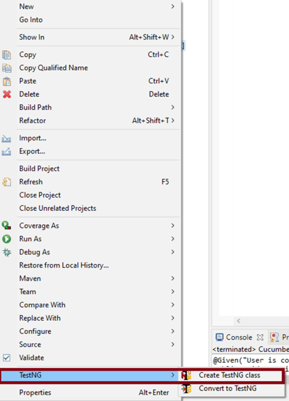 1) Create a new TestNG class. Right-click on the Folder where you want to create the TestNG class. Select TestNG and then Create the TestNG class as shown in the below image.