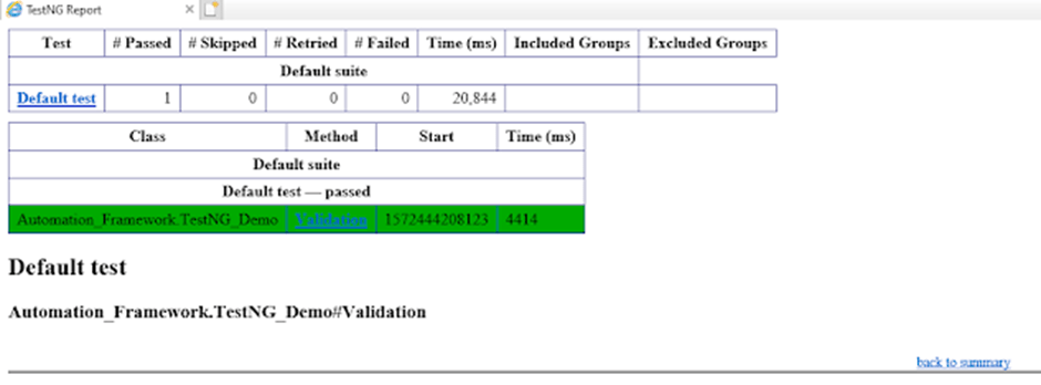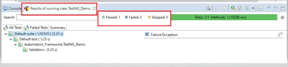 6) The result will look like something shown below. Here, we can see that Test Case Passed is 1, Failed 0, and Skipped 0.