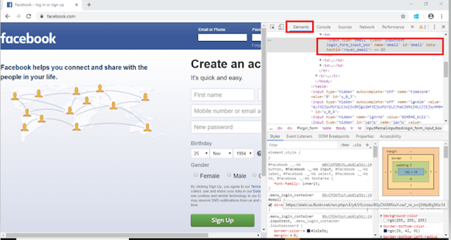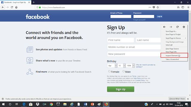 1. First step is to launch the Firefox Browser with desired URL. Here, we have launched Firefox browser and accessed Facebook page. I want to find the locator of Email or Phone textbox, so I will click on that textbox, right click, and click on “Inspect Element”.
