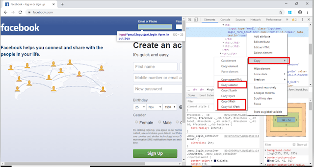3. In the screenshot, we can see the HTML code of Email or Phone Textbox. Right click on this text and then again click on Copy where will see options like – Copy Selector, Copy XPath, Copy full XPath