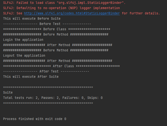 - @AfterSuite – The @AfterSuite method in TestNG runs after the execution of all other test methods. It will run only once after all tests in the suite have run.