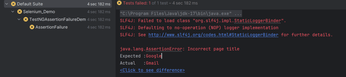 Lets see if an assertion fails, how the output looks shown below. In the below example, we are verifying the pageTitle of Gmail. If the test fails, we should see the message provided in the assertion also.