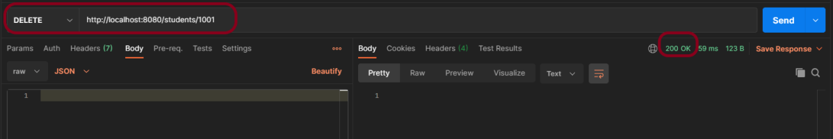 Now, we delete a Student with Id 1001 and the status code returned is 200.