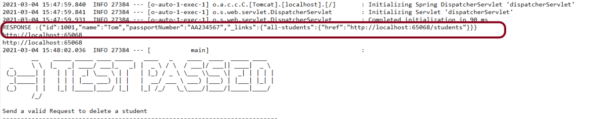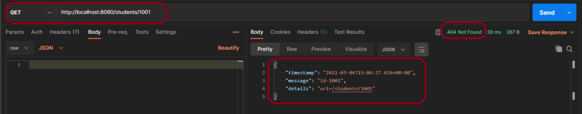 After deleting the resource, again send a request to get the details of student of id 1001 which returns 404 – Not Found status.