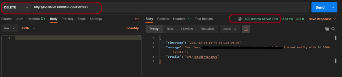 We can test the negative scenario similarly. Send a request with invalid student id, then we will get 500 Internal Server Error.