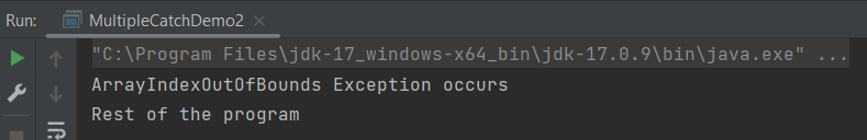 Scenario 1 – In the below example, an array is defined of size 10 and we want to perform an invalid arithmetic operation on element 15 of the array. In this case, we have defined 3 different catch handlers to handle the exception – Arithmetic Exception, ArrayIndexOutOfBounds Exception and Parent Exception. The try block has thrown exception – Arithmetic as the Arithmetic operation is invalid (divide by 0).