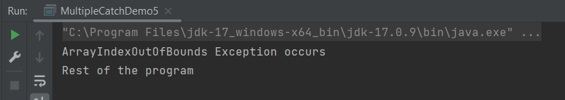 Scenario 5 – In the below example, try block has 2 exceptions. It will call the first suitable catch block for the first try statement which has thrown the exception.