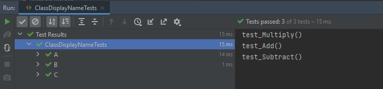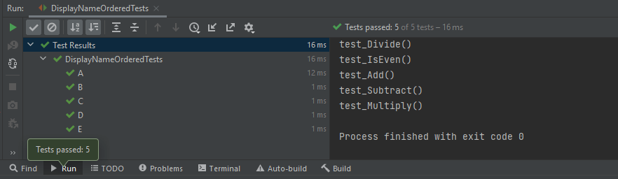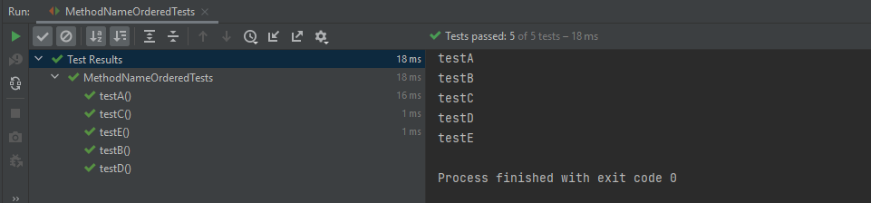 We can see that the test methods are sorted alphanumerically based on their display name starting from A to E. The output of the above program
