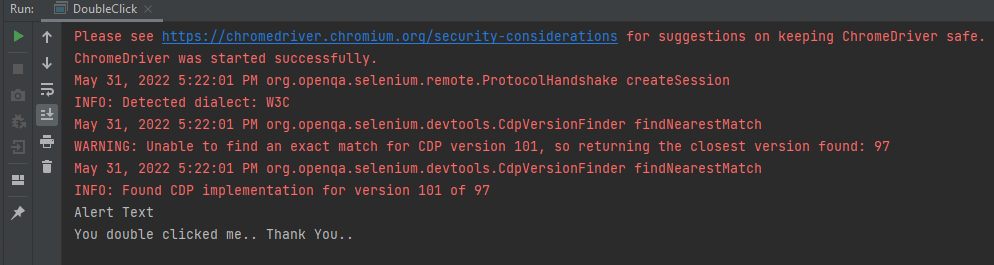 This method is added to replace moveToElement(element).doubleClick(). It will perform a double-click on an element.