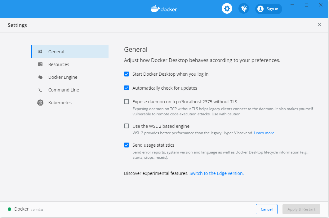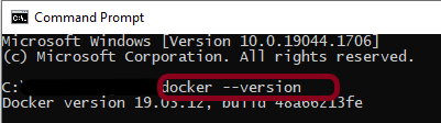 To see if Docker is correctly configured, run the following line in Command Prompt. The version of Docker installed on the system is provided.