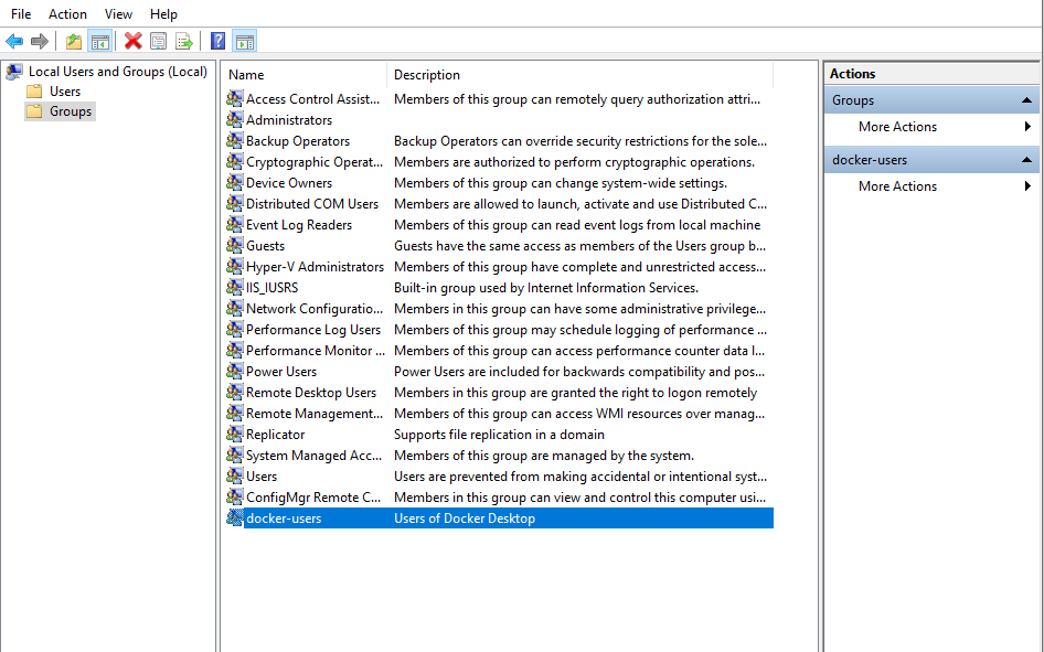 If the user account and admin accounts are different, the user account must be added to the docker-users group as shown below: