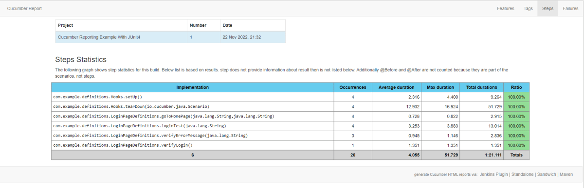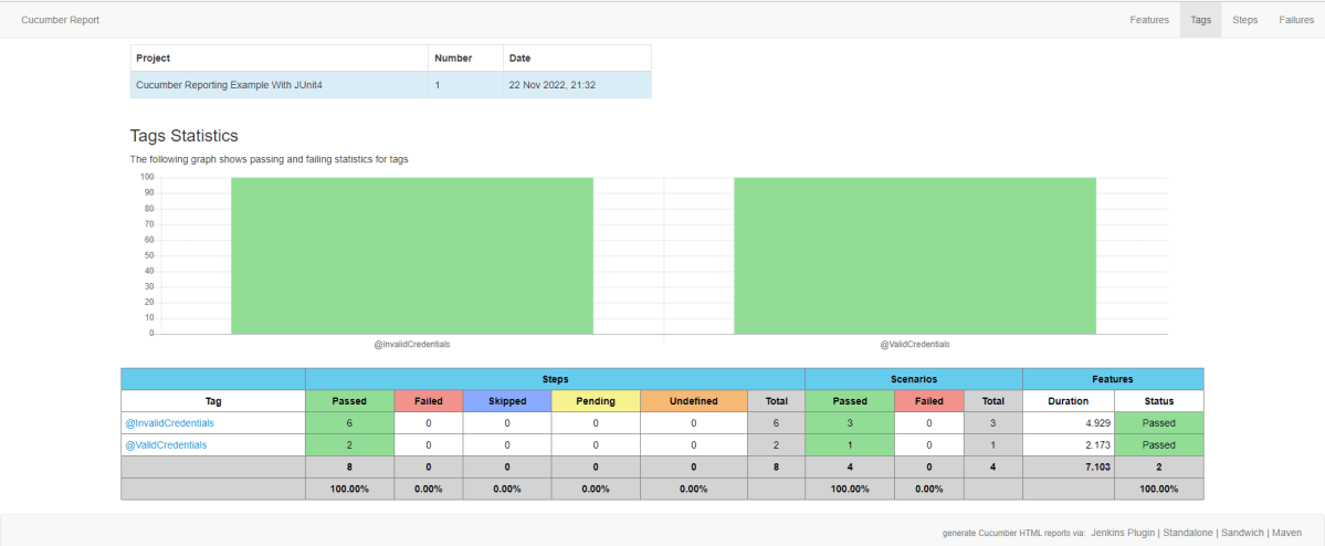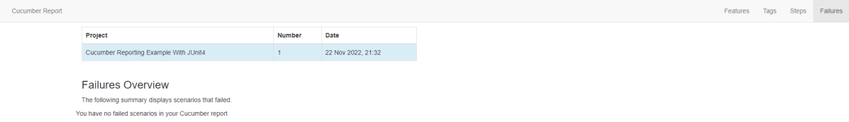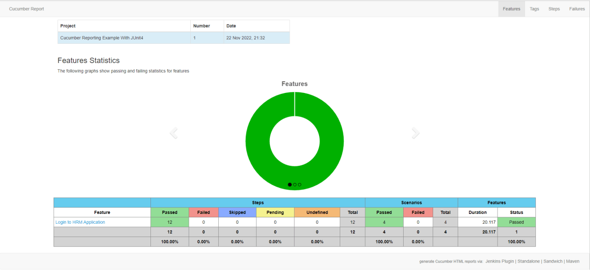 1. feature-overview – This HTML report gives an overall overview of test execution. Main HTML report which covers all different sections like Features, Tags, Steps, and Failures.