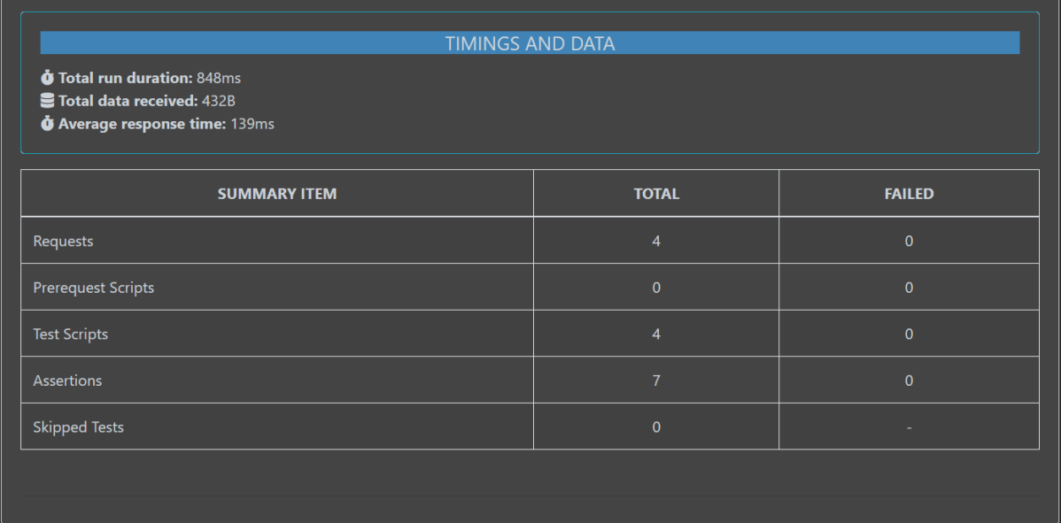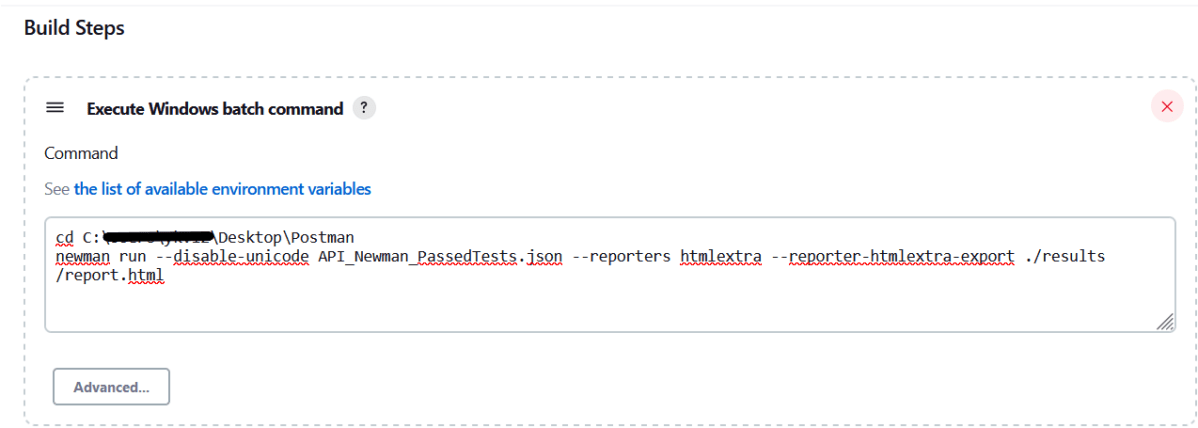 newman run --disable-unicode API_Newman_PassedTests.json --reporters htmlextra --reporter-htmlextra-export ./results/report.html