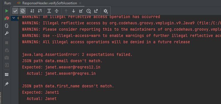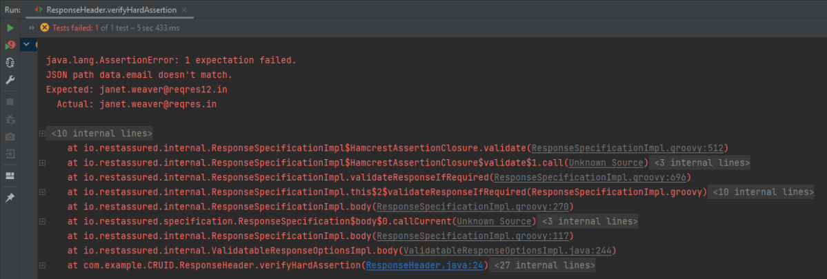 In the above example, email as well as first_name has incorrect data. But the assertion has checked email and as it has the incorrect data, it has failed the test without even checking for the rest two assertions.