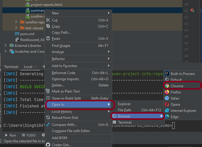 Right-click on the summary.html report and select Open In -> Browser ->Chrome.