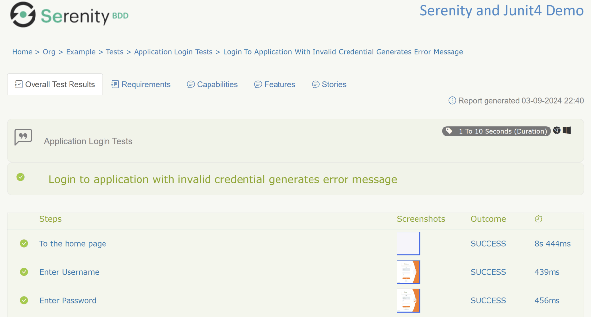 We can see the value of the @Title annotation, ‘Login to the application with valid credentials navigates to DashBoard page’, added as the heading. The value of @Step annotation, ‘Enter Username’, and ‘Enter Password’ is added to the Report as various steps.