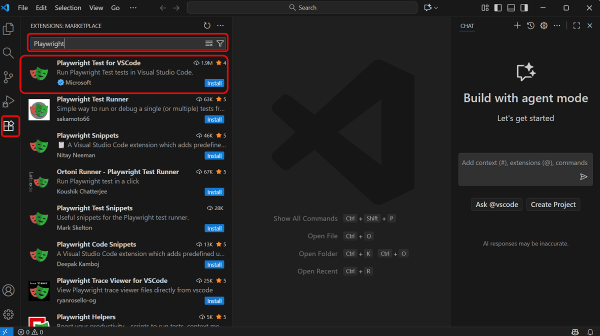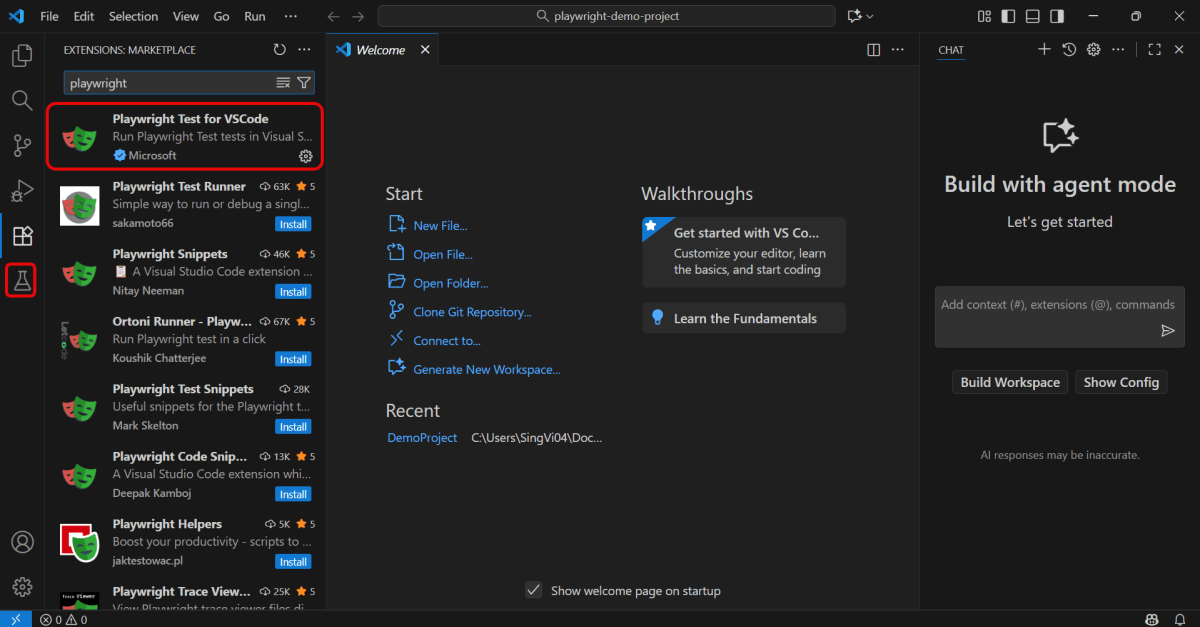 Open Visual Studio for Code. Install “Playwright Test for VSCode” from Microsoft via the Extensions tab.