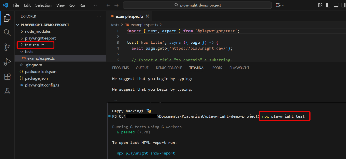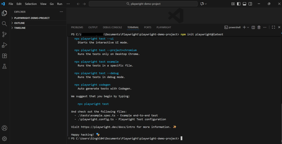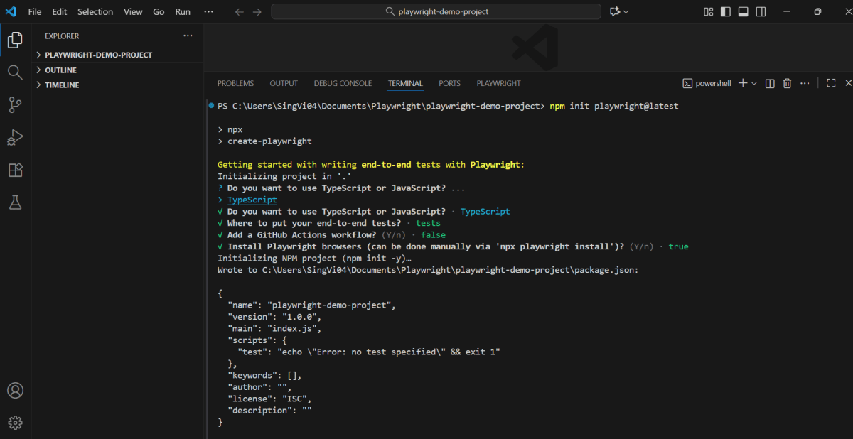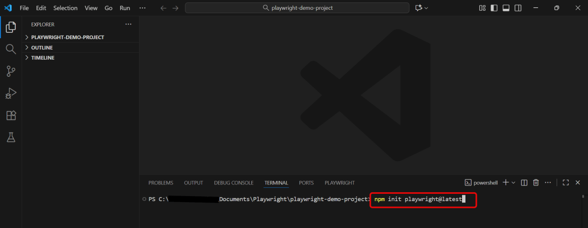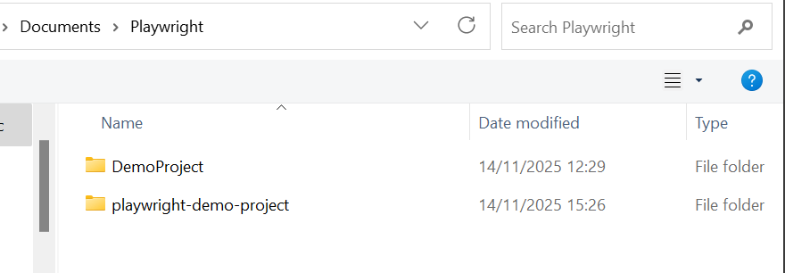 The new empty folder “playwright-demo-project” is created in Documents/Playwright folder.