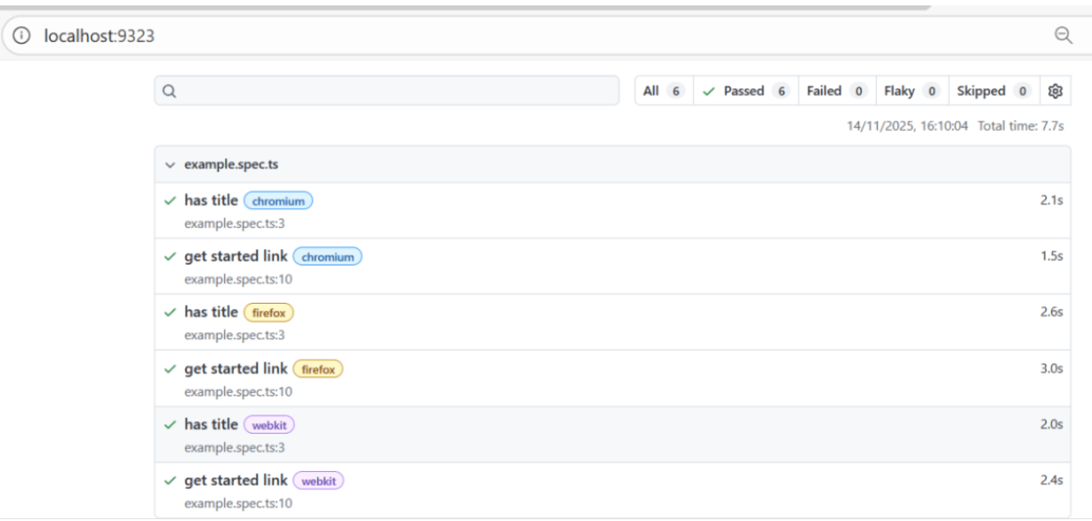 After a test run, the HTML Reporter provides a dashboard filterable by the browser, passed, failed, skipped, flaky and more. Click a test to inspect errors, attachments and steps. It auto-opens only when failures occur; open manually with the command below.