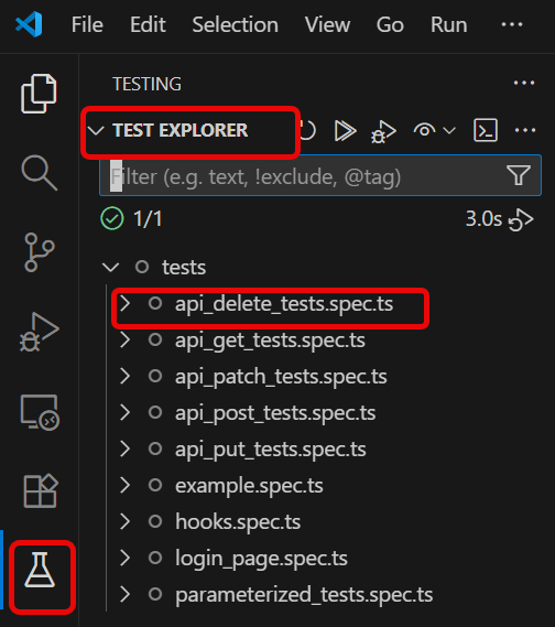 You can also come in and run all of the tests in a particular specification file. Alternatively, run individual tests within a specification file. Here, I want to run the tests of api_delete_tests.spec.ts file.