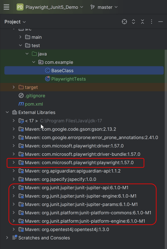 Add the Playwright and JUnit5 dependencies to the pom.xml. The latest dependency can be found from here.