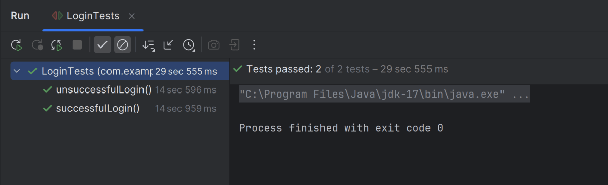 Go to the Test class and right-click and select Run ‘LoginTests’. The tests will run as JUnit5 tests (in IntelliJ).