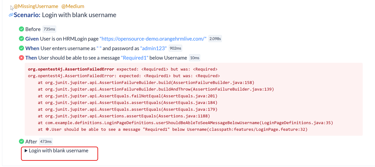 Assertions.assertEquals(expectedErrorMessage, loginPage.getMissingUsernameErrorMessage());