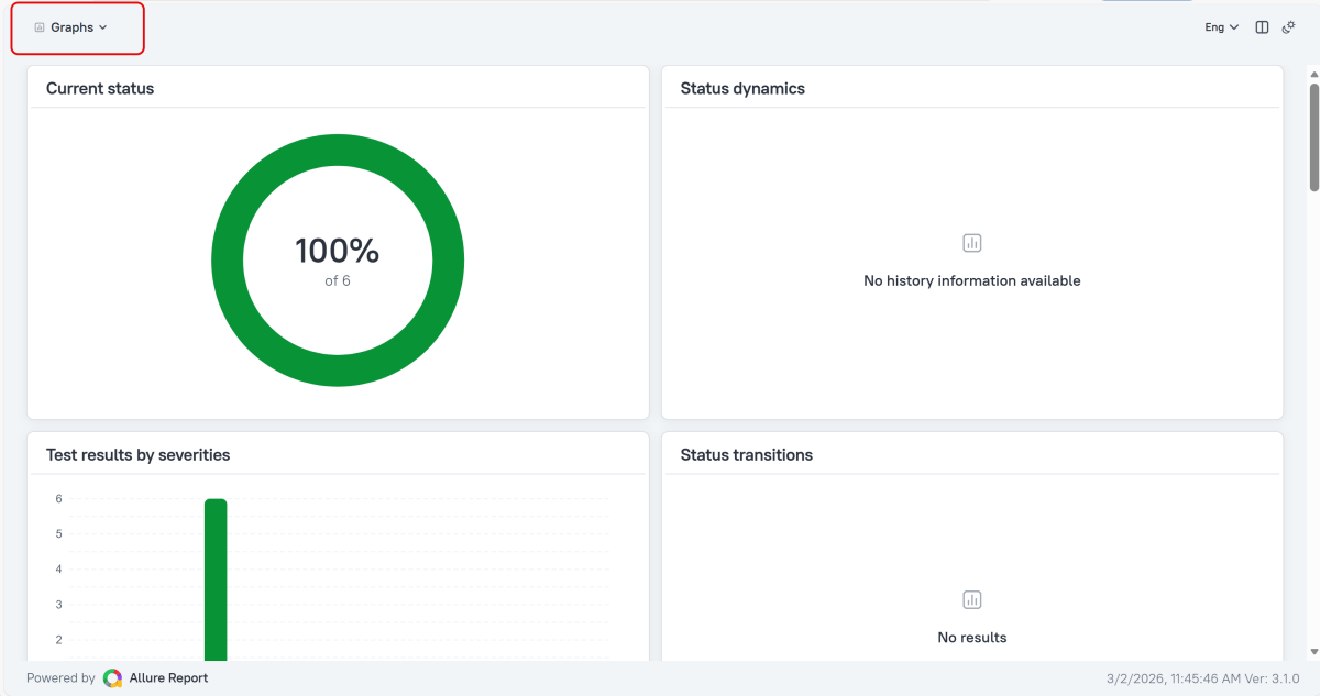 Graphs allow you to see different statistics collected from the test data: status breakdown or severity and duration diagrams.
