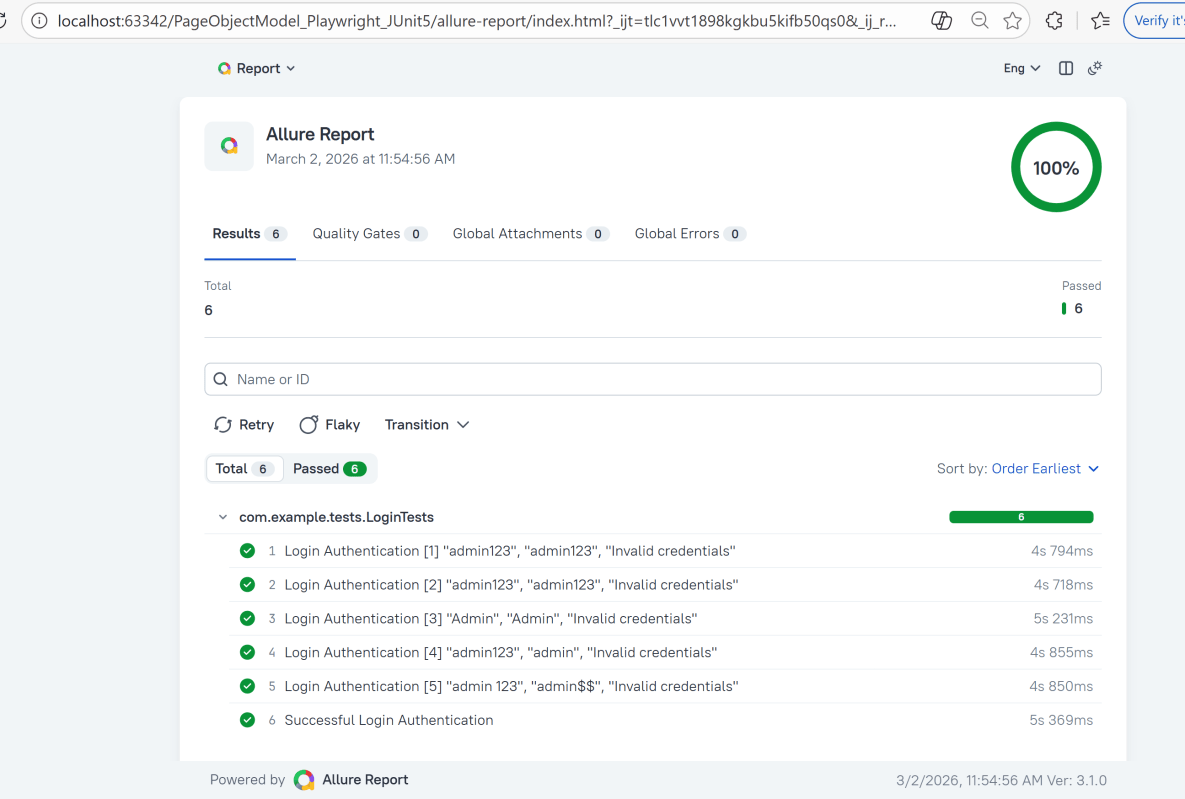 - Add required dependencies – Include Playwright, JUnit 5, and Allure JUnit5 in pom.xml, and configure the Allure Maven plugin.
