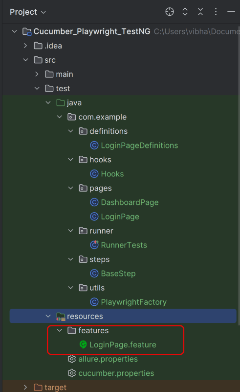 Create a folder – features within src/test/resources to create test scenarios in the Feature file.