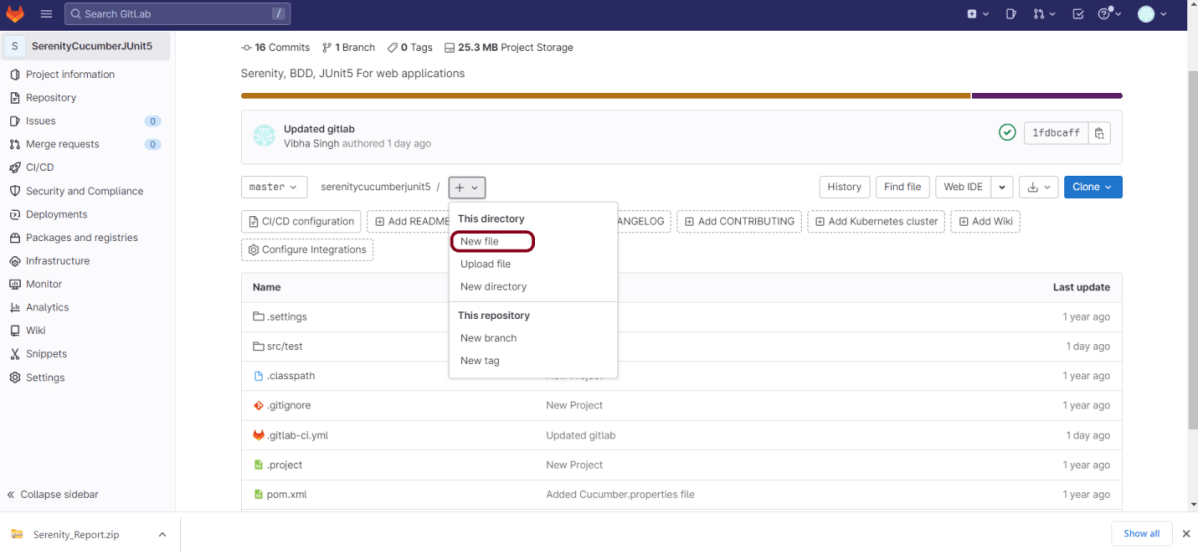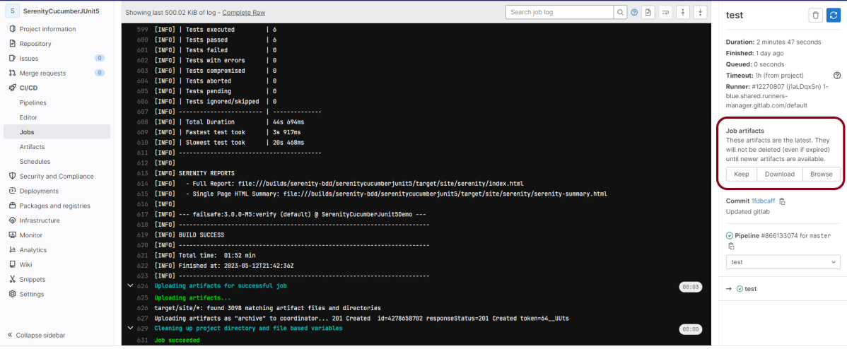 As I have added an artifact also in the .gitalb-ci.yml, which is highlighted in the image. This artifact creates a folder with the name “Serenity_Report”and the reports in this folder come from the path /target/site. This artifact gives us the option to download the reports or browse the report. This report will be available for 24 hours only as mentioned in the gitlab-ci.yml.