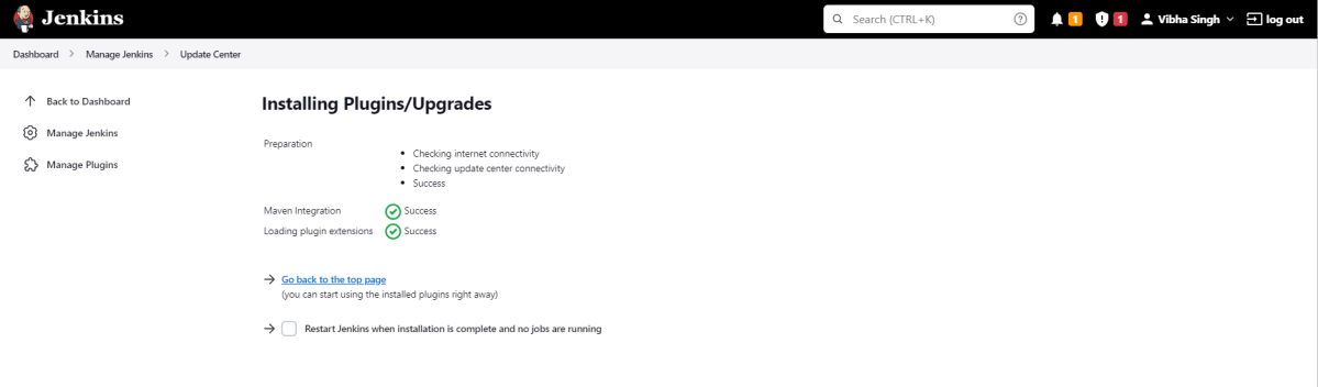 Click on the checkbox “Restart Jenkins when installation is complete when no jobs are running“.