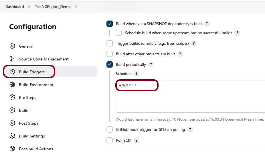 Here is a screenshot of a couple of builds on our system. The timestamps show that you’ve scheduled a job to run every five minutes.