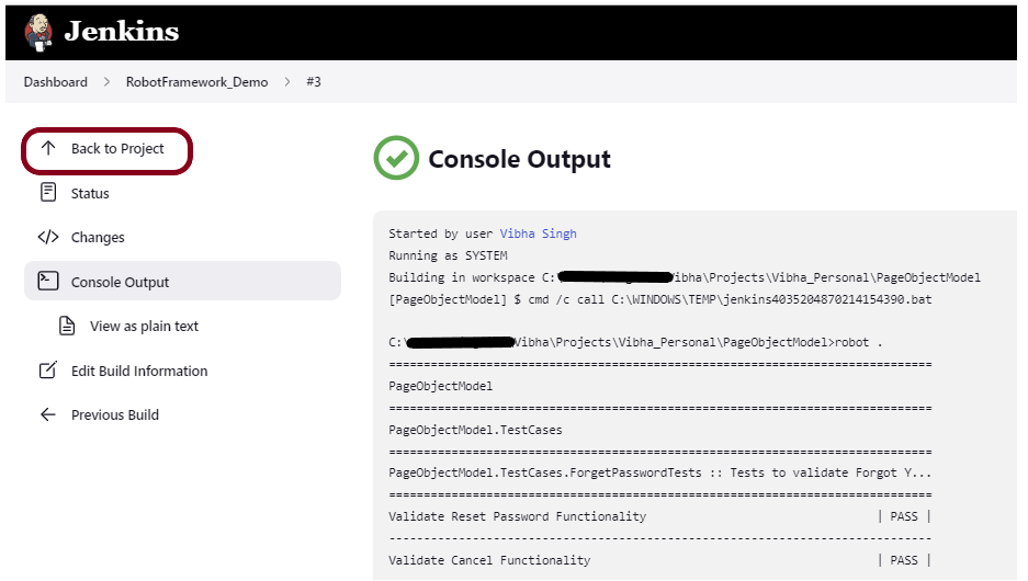 Once the execution is completed, click on go “Back to Project“, and we can see a link to view the “Extent Report“.