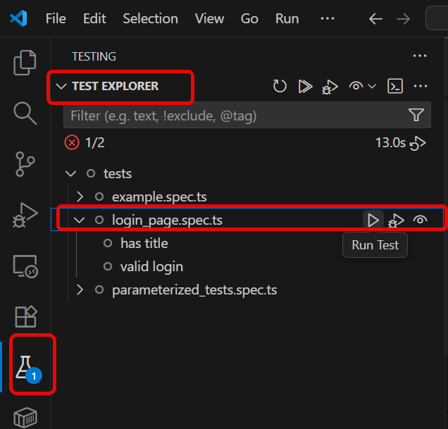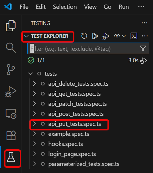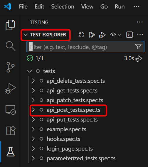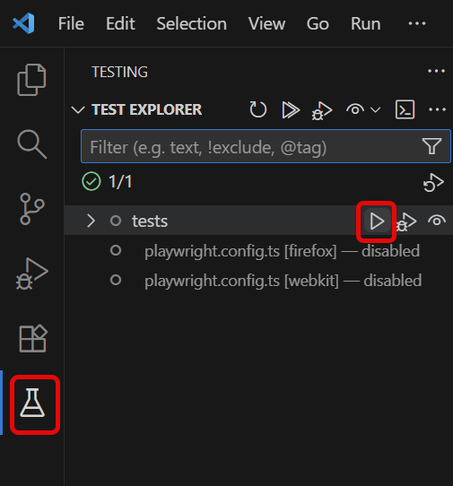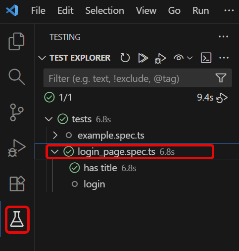 Go to the funnel shape icon called “Testing” or “Test Explorer View”. You can run the tests from the test Explorer view too now. You can run all of the tests in all of the test specs in this directory.