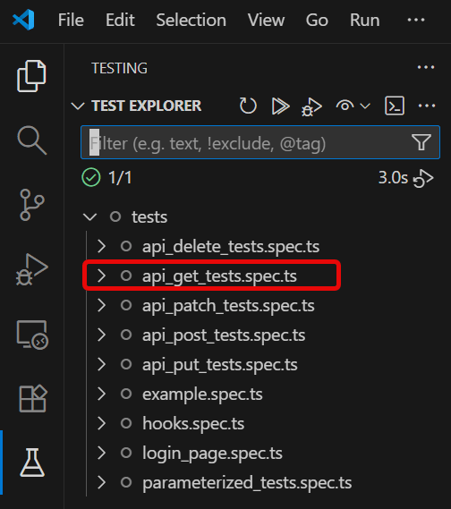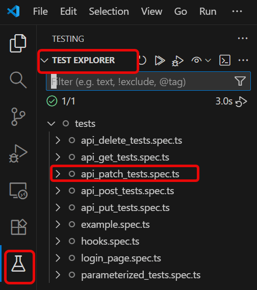 You can also come in and run all of the tests in a particular specification file. Alternatively, run individual tests within a specification file. Here, I want to run the tests of api_patch_tests.spec.ts file.
