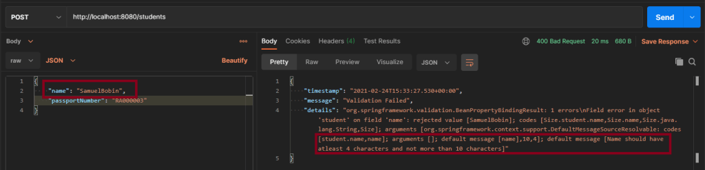 @Size(min = 4, message = "Name should have atleast 4 characters")