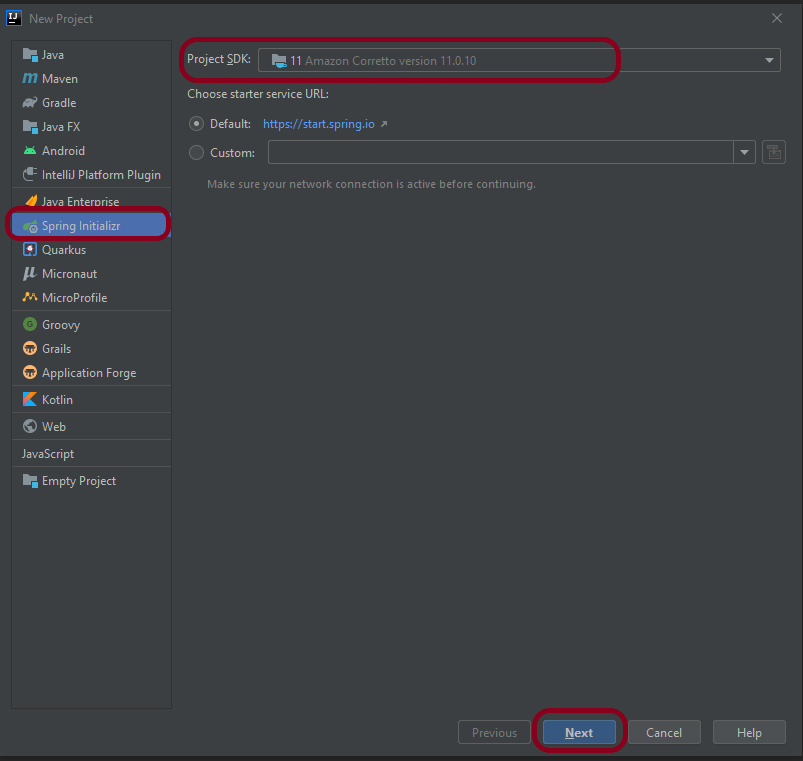 From the Project SDK list, select the JDK that you want to use in the project. I have used – 11 Amazon Corretto version 11.0.10.