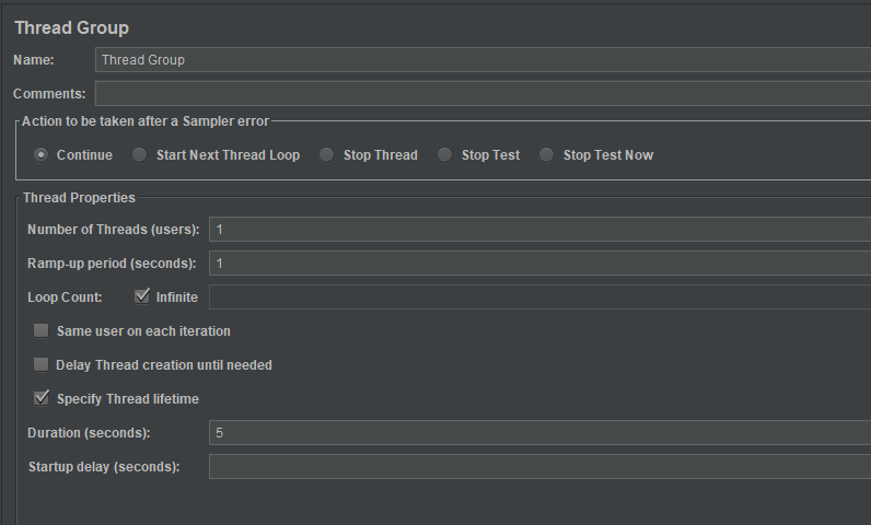 In the Thread Group control panel, enter Thread Properties as follows: