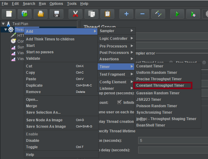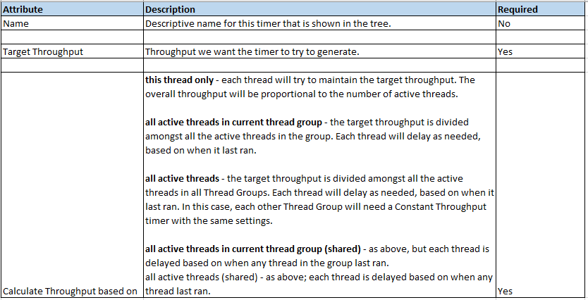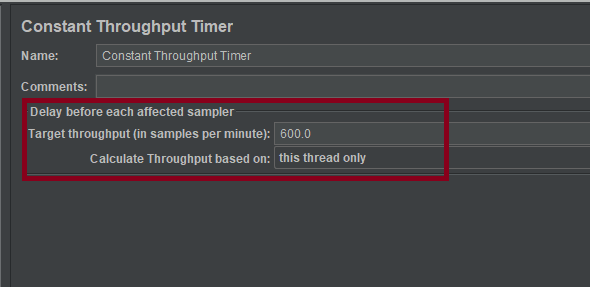 This timer allows us to keep total throughput constant. Constant Throughput Timer is only capable of pausing JMeter threads in order to slow them down to reach the target throughput so make sure you have enough threads in order to guarantee desired amount of requests per second. Also be aware that Constant Throughput Timer is precise enough only on minute level so you need to properly calculate ramp-up period and let your test run long enough. Of course, if the server is not able to handle such a load, the throughput will be lower. Throughput may decrease if other timers contradict the Constant Throughput timer.
