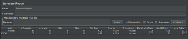 Summary Report – The summary report creates a table row for each differently named request in your test. This is similar to the Aggregate Report , except that it uses less memory.