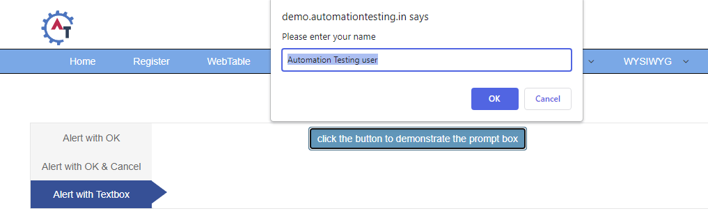 Below is an example that illustrates how to handle Prompt Alert using Selenium WebDriver.