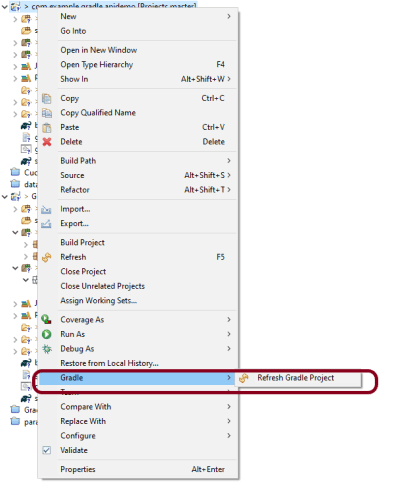 Once you have added dependencies, configurations, and Gradle cucumber task, Right-click on the project, Hover to the Gradle option, and click Refresh Gradle Project. Eclipse does not automatically update the classpath of the build.gradle file is updated. Select Gradle Refresh Gradle Project from the context menu of the project or from your build.gradle file for that.