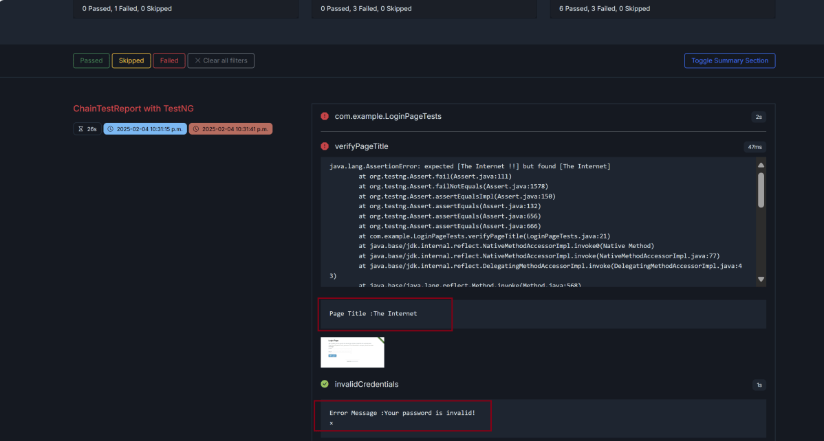 ChainTest Report is updated with the current test run as shown below:
