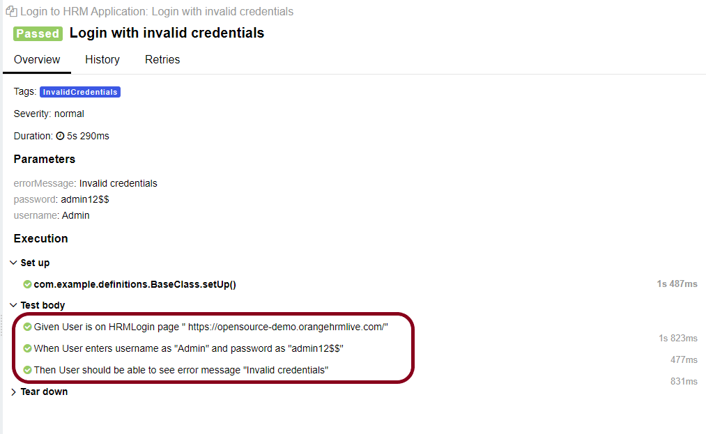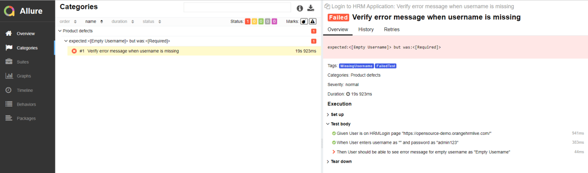 The PDF reporter summarizes the test run results in a dashboard and other sections with the feature, scenario, and, step details. The PDF report needs to be enabled in the extent.properties file.