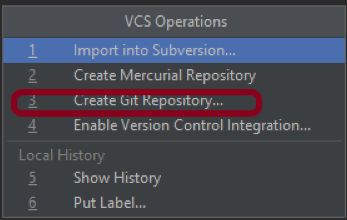Step 1 – Go to Git at the top, select VCS ->VCS Oprations -> Create Git Repository.