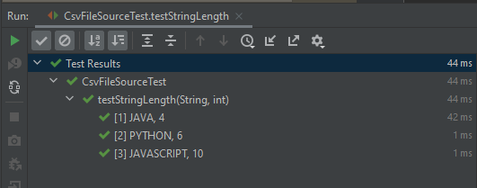 - Add the parameters source. In this example, we will use the @CsvFileSource annotation.