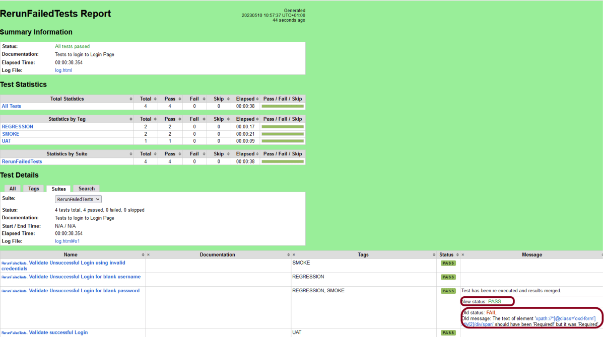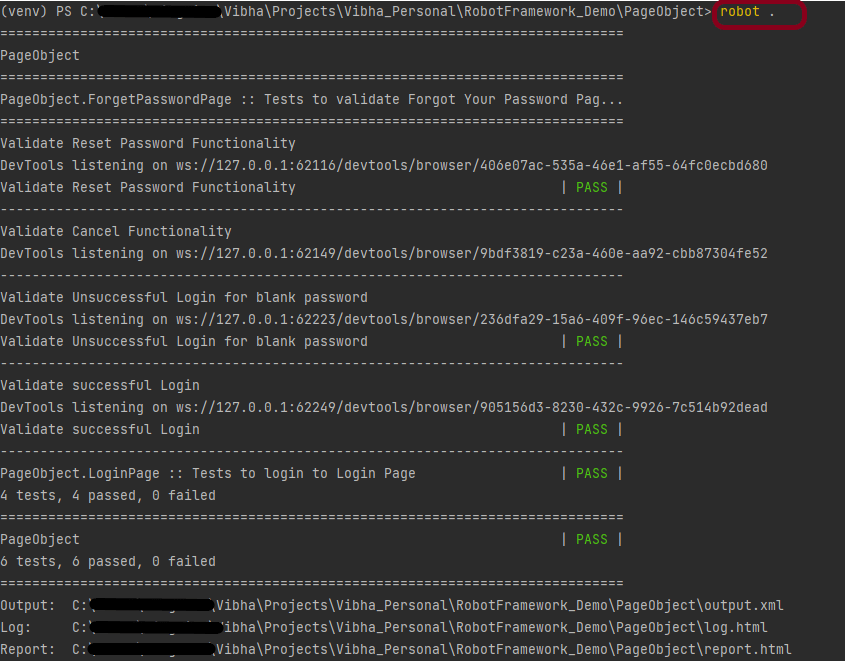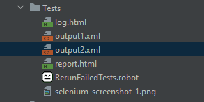 We have the test case passed. The Robot Framework generates log.html, output.xml, and report.html by default.
